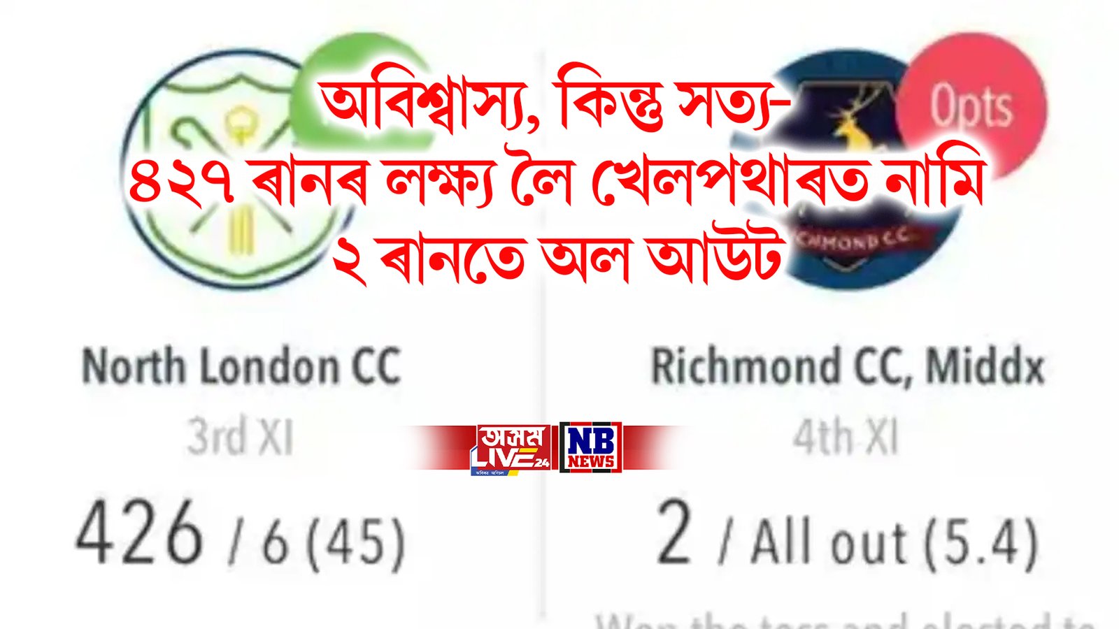 য’ত নৰ্থ লণ্ডন চিচি দলে প্ৰথমে বেটিং কৰি ৪৫ অভাৰত ৬ টা উইকেটত ৪২৬ ৰান সংগ্ৰহ কৰে। কিন্তু ৪২৭ ৰানৰ লক্ষ্য খেদি ৰিচমণ্ড চিচিৰ দলটোৱে ২ ৰানত অল আউট হয়।