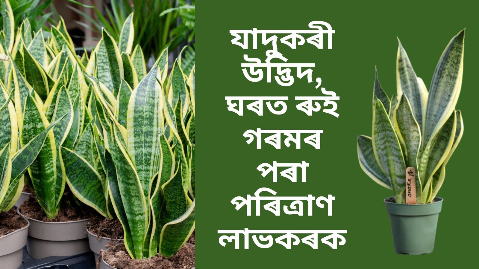 এই উদ্ভিদ জোপাৰ নাম স্নেক প্লাণ্ট তথা সাপ উদ্ধিদ। ইয়াৰ পাতত ভাইপাৰ সাপৰ দেহৰ দৰে ডিজাইন থকাৰ বাবে ইয়াৰ নাম সাপ উদ্ভিদ। অল ইণ্ডিয়া ইনষ্টিটিউট অৱ আয়ুৰ্বেদে স্নেক প্লাণ্ট সন্দৰ্ভত কৈছে যে, এই উদ্ভিদৰ যত্ন অতি সহজ। ইয়াৰ বাবে বেছি পানী বা সাৰৰ প্ৰয়োজন নহয় আৰু ইয়াক ঘৰৰ ভিতৰতো সহজে ৰোপণ কৰিব পাৰি।