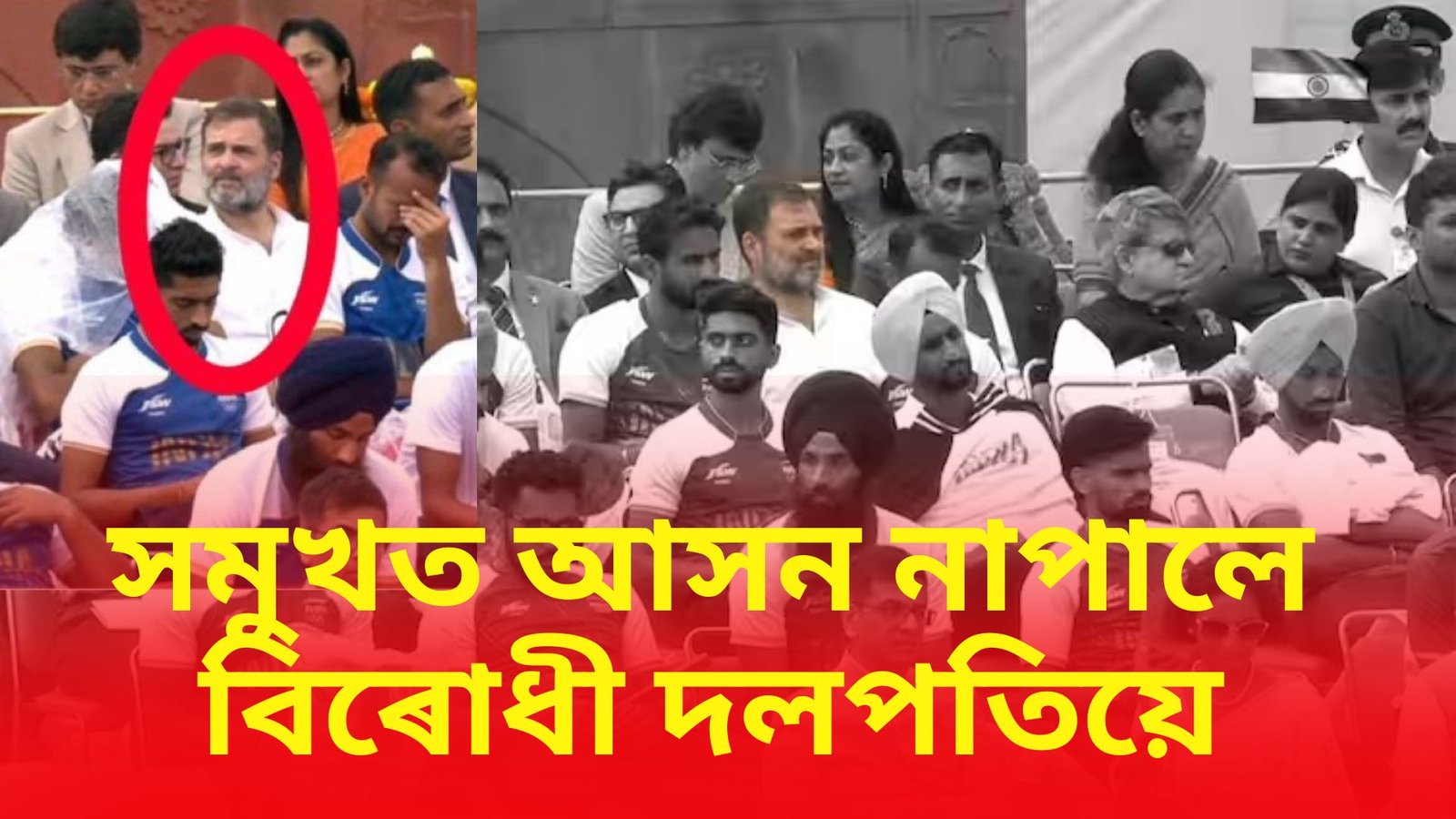 আচলতে অলিম্পিক পদক বিজয়ীসকলক ৰাহুলৰ আগত বহি থকা দেখা যায়। যি লাইনত তেওঁ বহি আছে, তাত হকী দলৰ কিছুমান খেলুৱৈও তেওঁৰ লগত বহি আছে। ৰাহুলৰ পিছফালে আৰু দুটা শাৰী, তাত আন কিছুমান অতিথি বহি আছে।