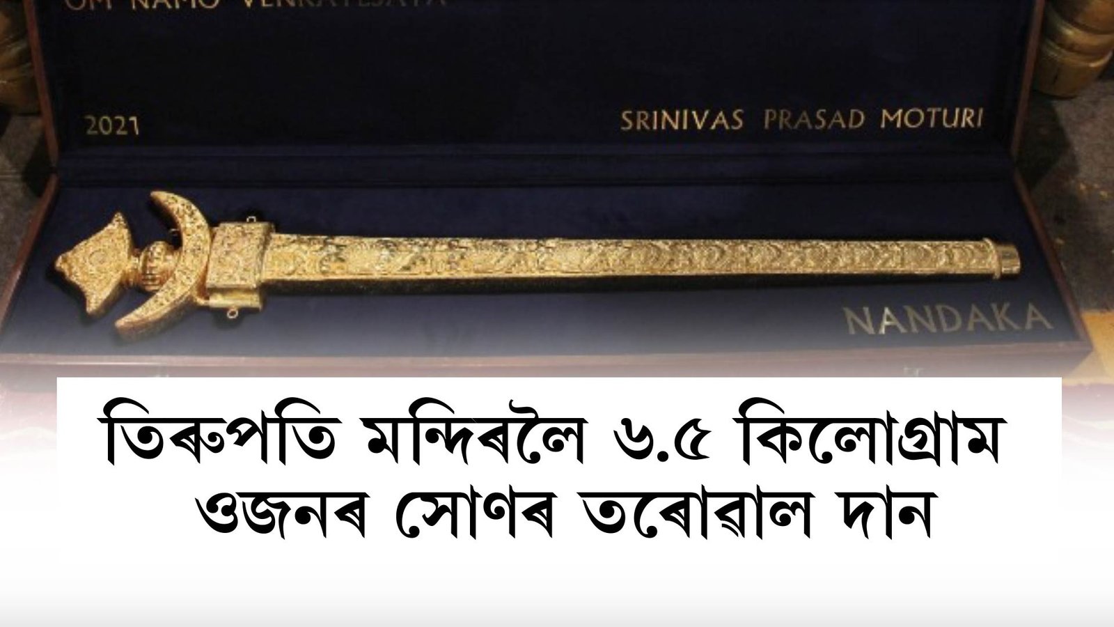 অসম লাইভ ২৪ঃ তিৰুপতি বালাজী মন্দিৰলৈ ভক্তৰ সোণৰ তৰোৱাল দান। ৬.৫ কিলোগ্ৰাম ওজনৰ সোণৰ তৰোৱাল আগবঢ়ায় হায়দৰাবাদৰ শ্ৰীনিবাস প্ৰসাদে। সোমবাৰে তিৰুমালা তিৰুপতি দেৱস্থানম (TTD) কর্তৃপক্ষৰ হাতত সোণৰ তৰোৱালখন অৰ্পন কৰে শ্ৰীনিৱাস দম্পত্তীয়ে৷ দেওবাৰে শ্ৰীনিৱাস দম্পত্তীয়ে তিৰুমালাৰ ‘কালেক্টিভ গেষ্ট হাউচ’ত সংবাদ মাধ্যমৰ সন্মুখত তৰোৱালখন প্ৰদর্শন কৰে৷ বিগত এবছৰ ধৰি শ্ৰীনিৱাস দম্পত্তীয়ে তৰোৱালখন আগবঢ়াব বিচাৰি আছিল যদিও ক’ৰোনাৰ বাবে মন্দিৰ বন্ধ থকাত সেয়া সম্ভৱ হোৱা নাছিল৷ জানিব পৰা মতে সোণৰ তৰোৱাল ‘সূর্য কটাৰী’খন শ্ৰীনিৱাস দম্পত্তীয়ে তামিলনাডুৰ কইম্বাতুৰত বিশেষভাৱে প্ৰস্তুত কৰাইছে৷ তৰোৱালখন প্ৰস্তুত কৰোতে ৬ মাহ সময়ৰ প্ৰয়োজন হৈছিল৷ প্ৰস্তুত কৰাৰ সময়ত তৰোৱালখনৰ মূল্য আছিল ১.৮ কোটি টকা, কিন্তু বর্তমান সময়ত ইয়াৰ মূল্য হ’বগৈ প্ৰায় ৪ কোটি টকা৷ ইয়াৰ পূর্বেও তামিলনাডুৰ এগৰাকী ব্যৱসায়ী থংগা দোৰায়ে ২০১৮ চনত তিৰুমলাস্থিত ভগৱান ভেংকটেশ্বৰক ১.৭৫ কোটি টকা মূল্যৰ এখন সোণৰ তৰোৱাল দান হিচাপে আগবঢ়াইছিল৷ সেই সোণৰ তৰোৱাল ‘সূর্য কটাৰী’ প্ৰস্তুত কৰোতেওঁ প্ৰায় ৬ কিলোগ্ৰাম সোণৰ প্ৰয়োজন হৈছিল৷ উল্লেখ্য যে অন্ধ্ৰপ্ৰদেশৰ চিত্তুৰ জিলাত তিৰুমালা পাহাৰত নির্মাণ কৰা শ্ৰী ভেংকটেশ্বৰ মন্দিৰ এক প্ৰসিদ্ধ হিন্দু তীর্থস্থান৷ বহু শতিকা পূর্বে নির্মাণ কৰা এই মন্দিৰটো ভাৰতীয় বাস্তুকলা আৰু শিল্পকলাৰ এক উৎকৃষ্ট নিদৰ্শন৷