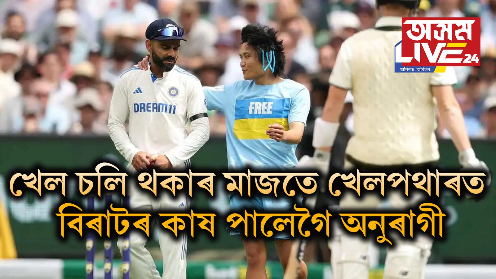 ভাৰত -অষ্ট্ৰেলিয়াৰ মাজৰ টেষ্ট খেলৰ মেলবৰ্ণ খেলত হঠাতে এগৰাকী অনুৰাগীৰ এক কাণ্ডই চকু কপালত তুলিছে সকলোৰে। সুৰক্ষীত সুৰুঙা থকাৰ সুবিধাৰে এগৰাকী অনুৰাগী প্ৰৱেশ কৰে খেলপতাৰত। যি সময়ৰ ভিডিঅ বৰ্তমানে ভাইৰেল হৈ পৰিছে সামাজিক মাধ্যমত।