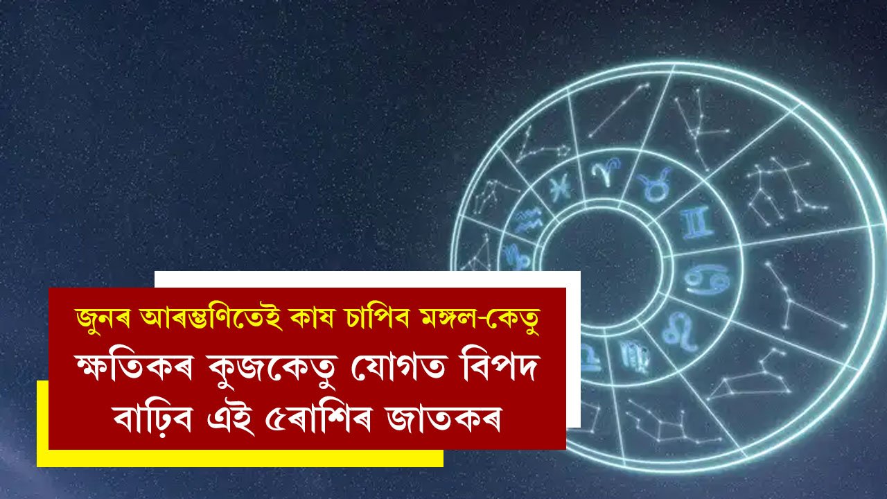 জুন মাহৰ আৰম্ভণিতেই সিংহ ৰাশিত মিলিত হব মঙল আৰু কেতু। ৭ জুনত মঙল সিংহ ৰাশিলৈ আহিব। কেতু তাত পূৰ্বৰে পৰাই অৱস্থান কৰি আছে। সেয়ে সিংহ ৰাশিতেই যুঁটি গঠন কৰিব মঙল আৰু কেতুৱে। জ্যোতিষ অনুসৰি মঙল হৈছে অগ্নি গ্ৰহ। এই গ্ৰহৰ প্ৰতীক জুই। আকৌ সিংহ ৰাশিৰ উপাদানো জুই। অন্যহাতে কেতু হৈছে ছায়া গ্ৰহ। জুই আৰু ছায়াৰ মিলনত গঠিত হৈছে কুজকেতু যোগ। বৈদিক জ্যোতিষ অনুসৰি এই যোগ কোনো কোনো ৰাশিৰ বাবে বিশেষ ক্ষতিকৰ হব পাৰে। জানি থওক কুজকেতু যোগৰ প্ৰভাৱত কাৰ কাৰ সন্মুখত ডাঙৰ বিপদ আহি আছে?
