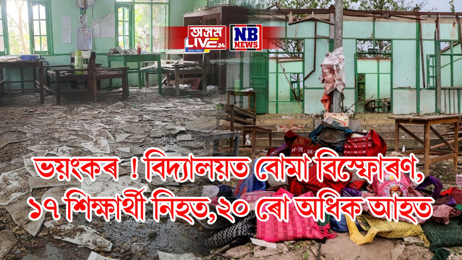 ভাৰতৰ চুবুৰীয়া দেশ ম্যানমাৰৰ এখন বিদ্যালয়ত সামৰিক জন্টাই বোমা বিস্ফোৰণ সংঘটিত কৰে। এই বোমা বিস্ফোৰণত ২২ গৰাকীকৈ শিক্ষাৰ্থী নিহত হোৱাৰ বিপৰীতে ২০ ৰো অধিক আহত হয়।