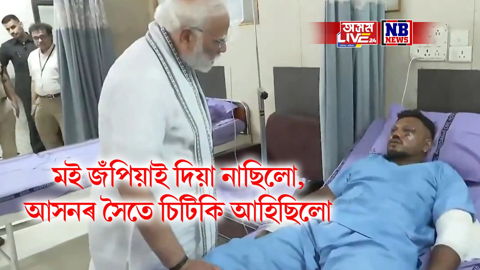 আজি ১৩ জুন শুকুৰবাৰে গুজৰাটৰ বিমান দুৰ্ঘটনাৰ ঘটনাস্থলী পৰিদৰ্শন কৰাৰ লগতে দুৰ্ঘটনাত প্ৰাণ ৰক্ষা পৰা একমাত্ৰ জীৱিত ব্যক্তি বিশ্বাস কুমাৰ ৰমেশক সাক্ষাৎ কৰে প্ৰধানমন্ত্ৰী নৰেন্দ্ৰ মোদীয়ে। কথা-বতৰাৰ সময়ত বিশ্বাসে প্ৰধানমন্ত্ৰীক কয় যে, ‘মই বিমানৰ পৰা জপিয়াই দিয়া নাছিলো, দুৰ্ঘটনাৰ সময়ত বহা আসনৰ সৈতে বাহিৰলৈ চিটিকি আহিছিলো’।