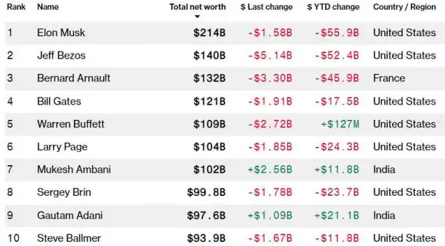 শেহতীয়াকৈ প্ৰকাশ পোৱা ব্লুমবাৰ্গ বিলিয়নাৰ ইনডেক্সৰ মতে বিশ্বৰ প্ৰায়সকল ধনকুবেৰৰ সম্পত্তি হোৰাহোৰে হ্ৰাস হৈছে৷ শুকুৰবাৰে প্ৰকাশ পোৱা ব্লুমবাৰ্গ বিলিয়নাৰ ইনডেক্সৰ মতে এলন মাস্কৰ পৰা ষ্টিভ ভলমাৰলৈকে প্ৰায় ৩০০ বিলিয়ন আৰৱ ডলাৰ সম্পত্তি লোকচানৰ সন্মুখীন হৈছে৷