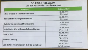 ৯ এপ্ৰিলত অনুষ্ঠিত হ’ব নিৰ্বাচন। অসমত এটা পৰ্যায়তে ১২৬ টা সমষ্টিৰ নিৰ্বাচন অনুষ্ঠিত হ’ব। নিৰ্বাচনৰ বাবে মনোনয়ন দাখিলৰ অন্তিম দিন ২৩ মাৰ্চ, মনোনয়ন পৰীক্ষণৰ অন্তিম দিন ২৪ মাৰ্চ আনহাতে